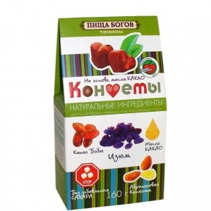 Благодаря какао-бобам и какао-маслу конфеты содержат большое количество легкоусвояемых витаминов (А, Е, РР, группа В, бета -каротин) и минералов (кальций, калий, магний, натрий, фосфор, сера, хлор, железо, цинк, медь, марганец, фтор, молибден), а так же пищевые волокна, органические кислоты, насыщенные жирные кислоты, растительный белок (около 12 г на 100 гр. продукта). Изюм же издавна употреблялся для укрепления нервной системы и как хорошее успокоительное средство. Кроме того, он помогает при малокровии и рекомендуется беременным, так как богат железом и магнием. Помимо полезных свойств, конфеты обладают замечательным вкусом, послужат отличным полезным лакомством для детей и взрослых. Сладость конфетам придают натуральные сухофрукты, в процессе приготовления не используется сахар, загустители, консерванты и ГМО. Такого Вы еще не пробовали!