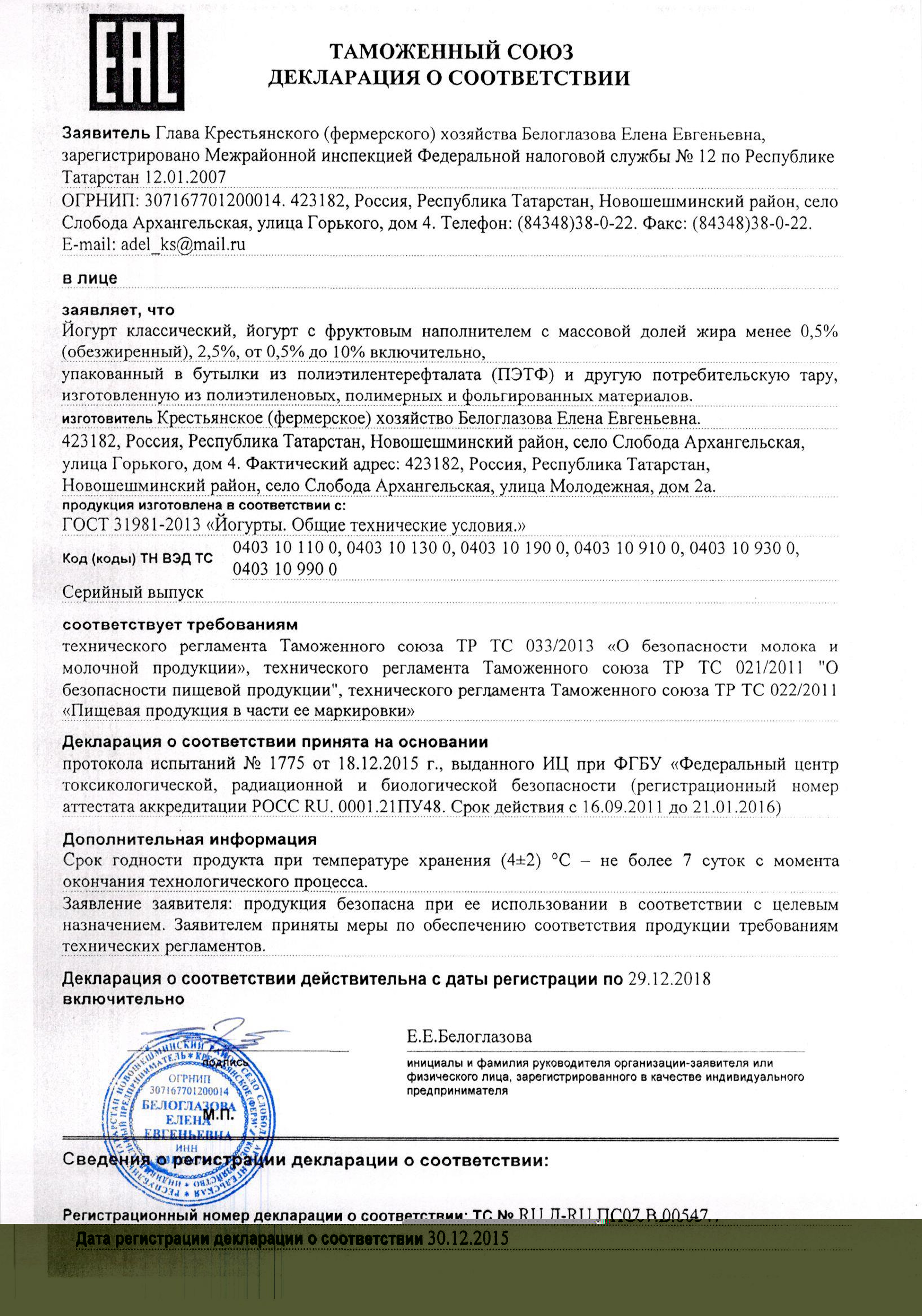 При термостатном способе молоко КФХ Белоглазовых сразу разливается по стаканчикам, туда же вносят закваски и помещают в специальную камеру с определенной температурой для сквашивания. В этой же таре термостатный йогурт и другие термостатные молочные продукты поступают к потребителю. Продукт пользуется особым спросом среди соблюдающих лечебные и фитнес диеты. Не содержит ароматических добавок.