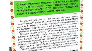 Состав: пчелиный воск, масло карите (ши), жожоба голд, масло семян мака, персиковое масло, миндальное масло, СО2 экстракт зародышей пшеницы, эфирное масло мяты и герани.