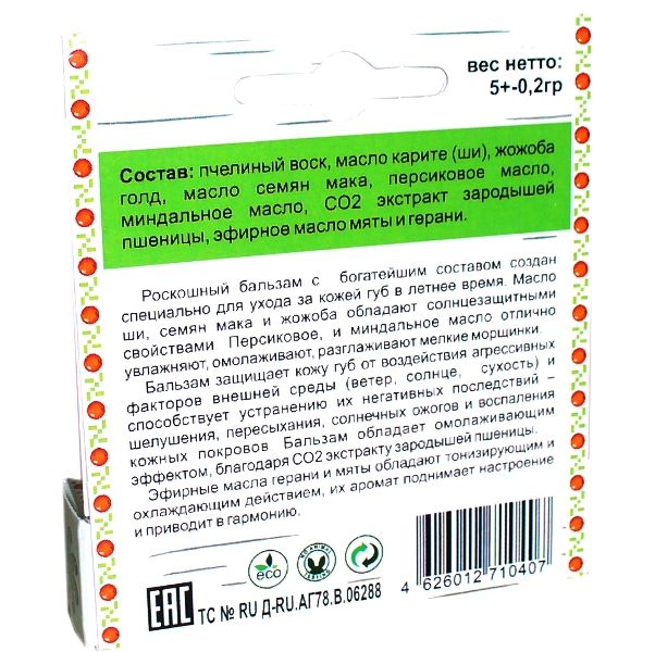 Описание: Роскошный бальзам с богатейшим составом создан специально для ухода за кожей губ в летнее время. Масло ши, семян мака и жожоба обладают солнцезащитными свойствами. Персиковое, и миндальное масло отлично увлажняют, омолаживают, разглаживают мелкие морщинки. Пчелиный воск смягчают и вместе с тем образуют на поверхности губ тоненькую защитную пленочку. Бальзам защищает кожу губ от воздействия агрессивных факторов внешней среды (ветер, солнце, сухость) и способствует устранению их негативных последствий – шелушения, пересыхания, солнечных ожогов и воспаления кожных покровов. Бальзам обладает омолаживающим эффектом, благодаря СО2 экстракту зародышей пшеницы. Эфирные масла герани и мяты обладают тонизирующим и охлаждающим действием, их аромат поднимает настроение и приводит в гармонию.