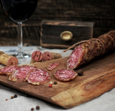 Салями представляет собой сыровяленую колбасу, щедро сдобренную специями. Она по праву считается одной из самых соблазнительных по вкусу колбас в мире: именно ее деликатесный аромат зачастую украшает скучные бутерброды и классическую итальянскую тарелку с закусками. Наша колбаса приготовленна из телятины, которое хорошо приправленна, просоленна и высушена на открытом воздухе.