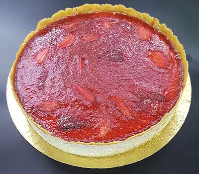 Сыр творожно-сливочный, сливки животные 33%, белый шоколад, пюре клубники, клубника, сахар, яйцо куриное, масло сливочное, желток яичный, белок яичный, мука хлебопекарная пшеничная высший сорт, пектин цитрусовый, стручок бурбонской ванили.