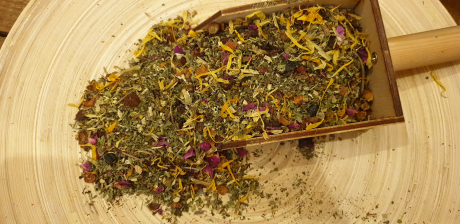 Зеленый китайский чай с ягодами вишни, кубиками желтого манго, сочного персика, ананасовыми кусочками, красными и оранжевыми цукатами, лепестками подсолнуха и сафлоры. Благоприятно влияет на нервную систему и сосуды.