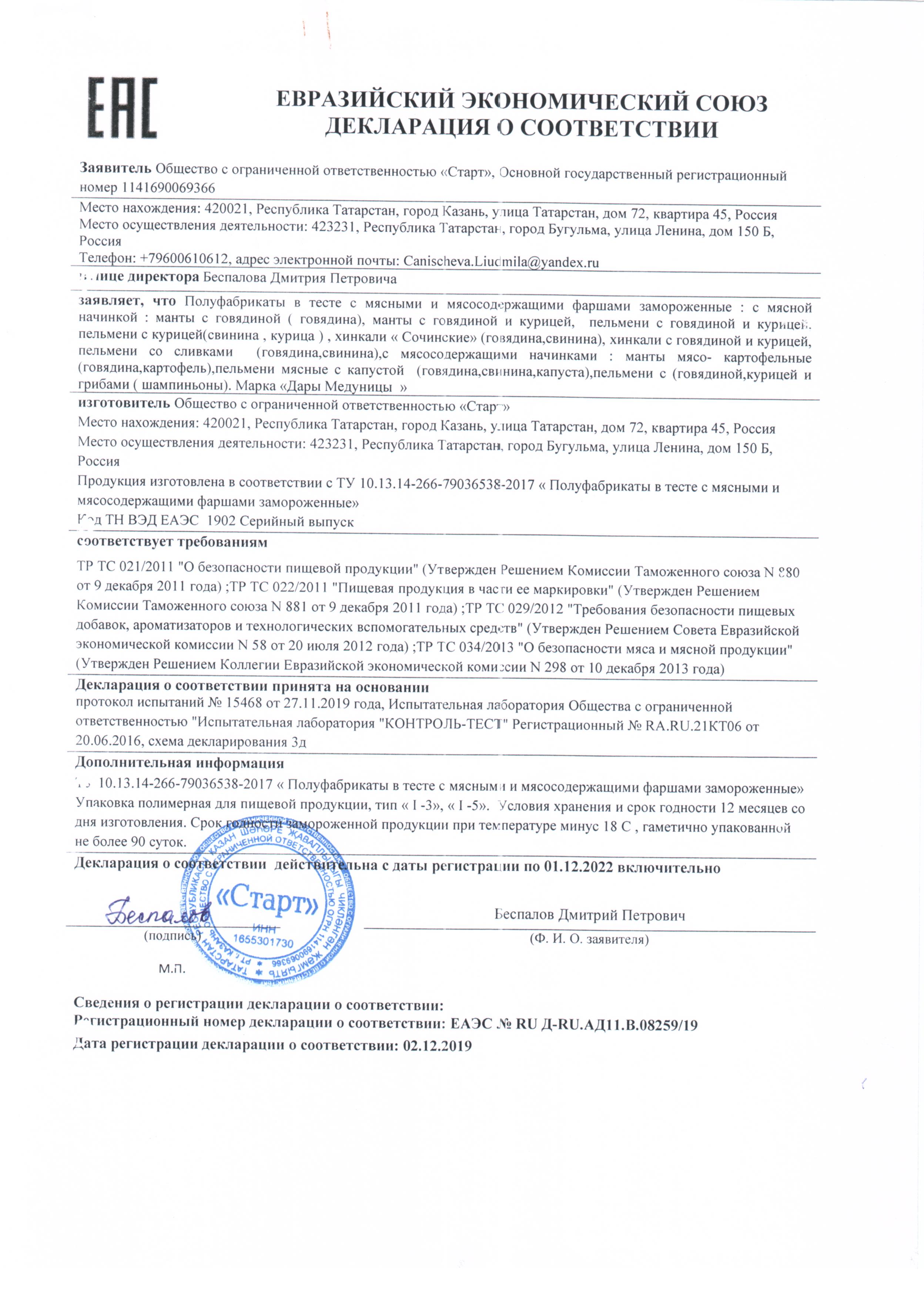 Фарш:мясо говядины,лук репчатый, соль,сахар,перец черный. Тесто: мука в/с, вода питьевая, яйцо куриное, соль.