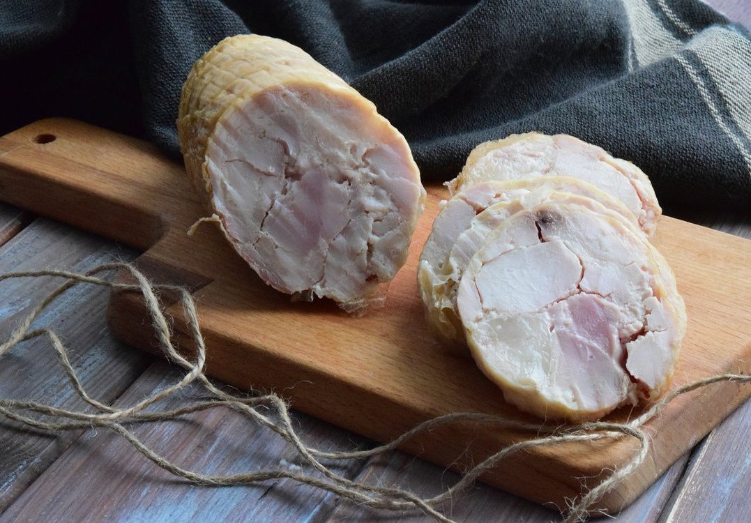 Для производства ветчины используют кусковое мясо, полученное с грудной части и окорочков тушек цыплят-бройлеров путем обвалки вручную. Продукт, в процессе выработки подвергнутый посолу с последующим доведением до готовности к употреблению термической обработкой из кусков мяса и мышц, который может быть фаршированным, формованным, в оболочке или без нее. Внешний вид: