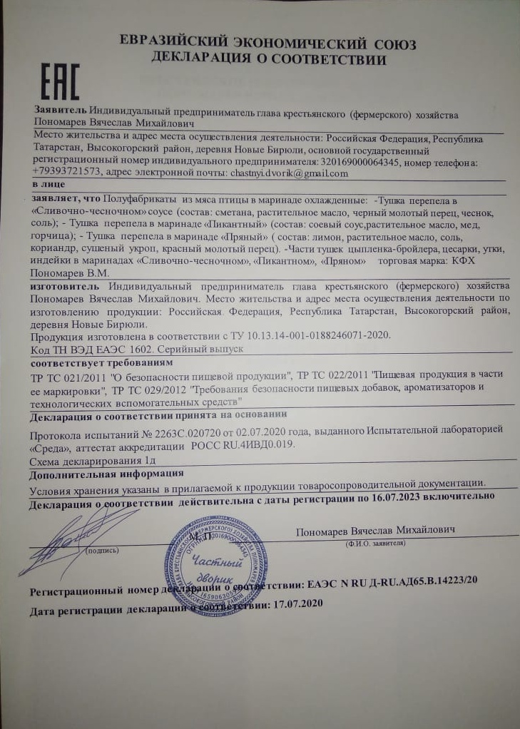 Рекомендуемые сроки годности охлажденного мяса перепела при температуре воздуха в холодильной камере от 0 °С до 2 °С включительно: тушек - не более 5 сут.