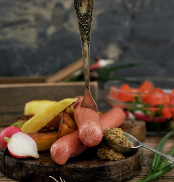 Немного подкопченные на буковых щепах ароматные сосиски из телятины. Покупателям нужно просто опустить их в горячую воду на 5 -7 минут, чтобы разогреть. Кипятить их нельзя — они потеряют свой аромат.