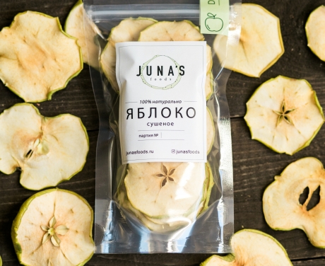 Тонкие нежные кусочки яблок. Мягкий сладковатый вкус, знакомый с детства. Благодаря приготовлению при температуре не выше 40 градусов, сохраняют большинство полезных свойств. Яблоко содержит клетчатку, органические кислоты, калий, натрий, кальций, магний, фосфор, железо, йод, а также витамины А, В1, В3, РР, С и др.