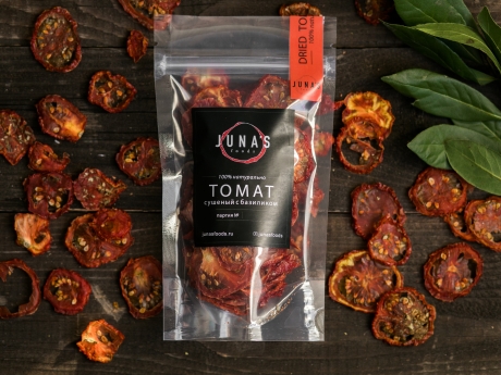 Тончайшие хрустящие слайсы томата, посыпанные ароматнейшим базиликом. Характерный кисло-сладкий вкус томата, с терпкой ноткой базилика. Благодаря приготовлению при температуре не выше 40 градусов, сохраняют большинство полезных свойств. В составе томатов в большом количестве содержатся клетчатка, пектины, бета-каротин, витамины В1, В2, В5, В6, В9, С, К, Н и РР, а также нужные организму человека минеральные вещества: калий, кальций, магний, цинк, железо, хлор и сера, йод, фосфор, фолиевая кислота. По содержанию аскорбиновой кислоты томаты стоят в одном ряду с цитрусовыми и чёрной смородиной.