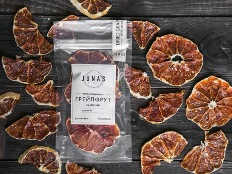 Тонкие хрустящие дольки грейпфрута. Имеют характерный горьковатый вкус и насыщенный аромат. Благодаря приготовлению при температуре не выше 40 градусов, сохраняют большинство полезных свойств. Грейпфрут относится к диетическим продуктам. Антиоксиданты, содержащиеся в нем, снижают уровень холестерина в крови. Утверждается, что экстракт семени грейпфрута обладает сильным противомикробным и противогрибковым действием.