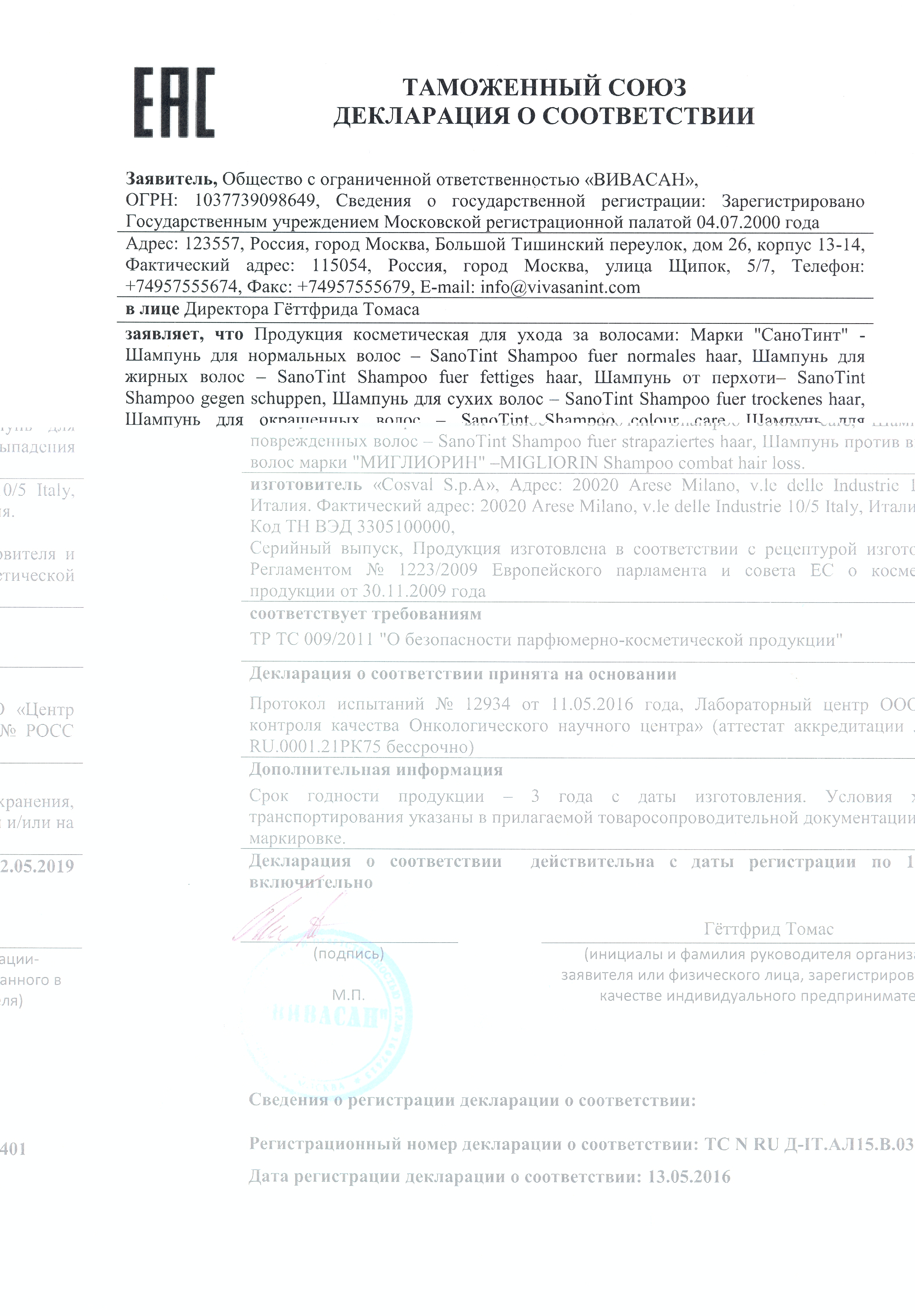 Изготовитель:«COSVAL S.p.A», Arese, Италия