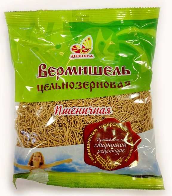 Вермишель пшеничная 350г Дивинка -содержит витамины группы В и группы Е, минеральные элементы, незаменимые аминокислоты, пищевые волокна (клетчатку), необходимые организму человека, восполняет дефицит пищевых волокон, очищает организм от шлаков и ядовитых продуктов распада,очень полезна для кишечника,при обойном помоле в муке остаются абсолютно все составляющие зерна. Это и цветочная оболочка зерна, и алейроновый слой, и зерновой зародыш. Соответственно, в обойной муке сохраняется вся биологическая ценность цельного зерна, и все его целебные качества для организма человека.